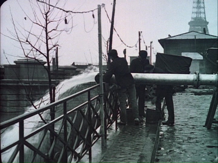 The Seine Flood shows the wooden walkways, the rising water flowing under the bridge, the boats. Probably the most dynamic and interesting shots are from a camera mounted on one of these boats as it floats through the streets of Paris. We also see efforts to reduce the floodwaters with the use of drainage pumps.
