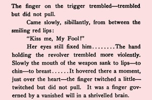 The line comes from A Fool There Was (1915), Theda Bara’s first vamp film. (You can read my full review here.) Bara plays a seductress who drains men of their wealth and then drives them to disgrace and, often, death. She is confronted with a former lover who is armed with a pistol. When he threatens to kill her, she hisses this deathless line. He obeys and then obligingly shoots himself. (Did I mention that this is kitschy stuff?)