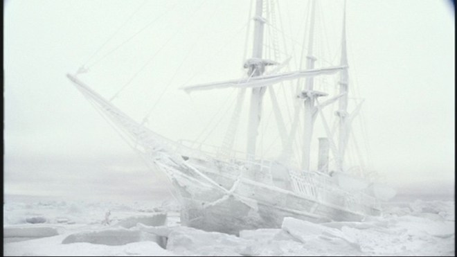 Hurley combines footage of wildlife with stunning images of the Endurance cutting through the icy waters. We are shown the daily life of the crew and many shots of the sled dogs that accompany them on the voyage. (Then as now, cute puppy dogs guarantee a happy audience.) Finally, the Endurance is trapped in ice and Hurley captures the famous, ghostly images of the frozen ship.