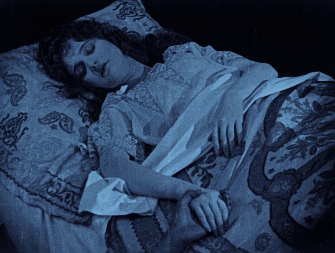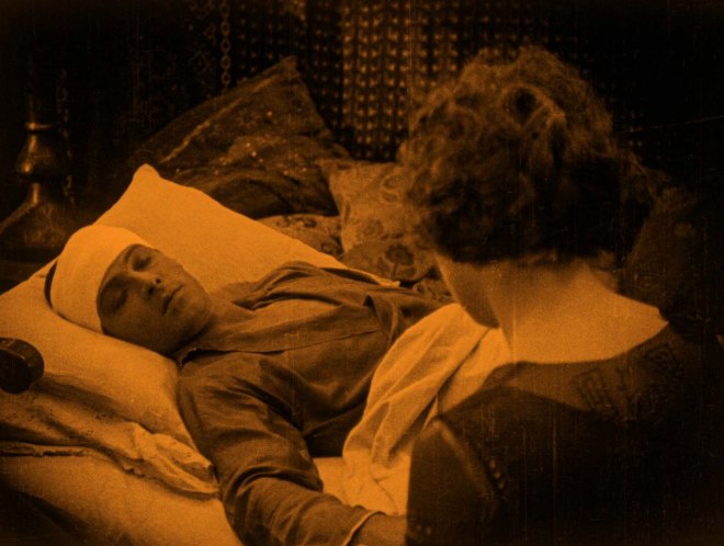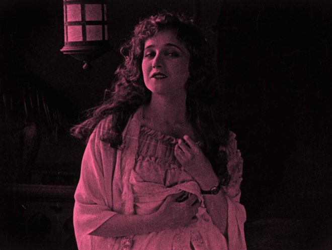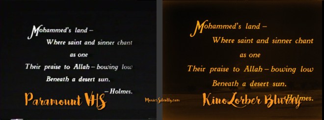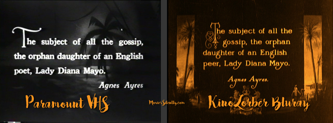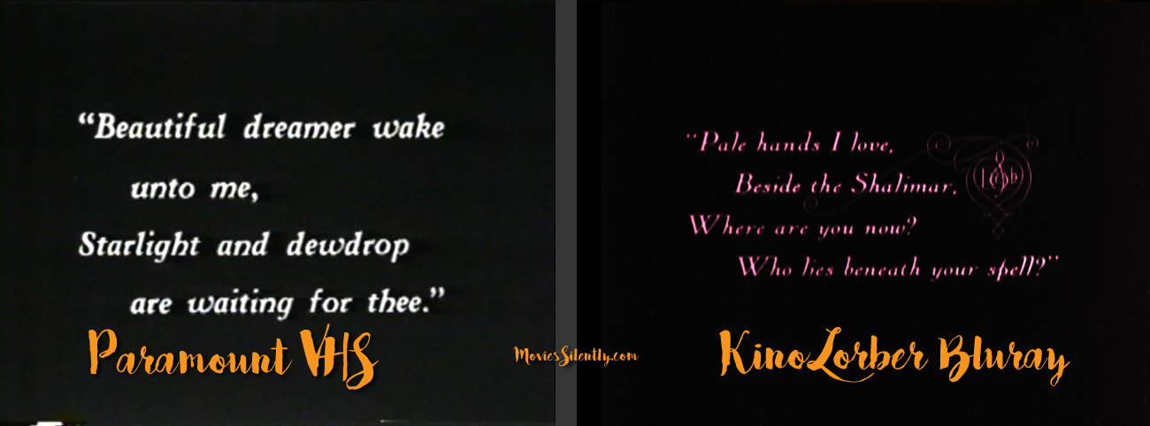The Shepard DVD is tinted and seems to contain the original release title cards with elaborate artwork but lacks the no-hanky-panky scene. The other major difference between these older editions is that the Paramount VHS has Diana serenaded with Beautiful Dreamer while the Shepard DVD has Kashmiri Song. The latter piece’s reference to pale hands makes it the much better choice as the relative size and shade of the characters’ hands figures into the plot. (Don’t ask.)