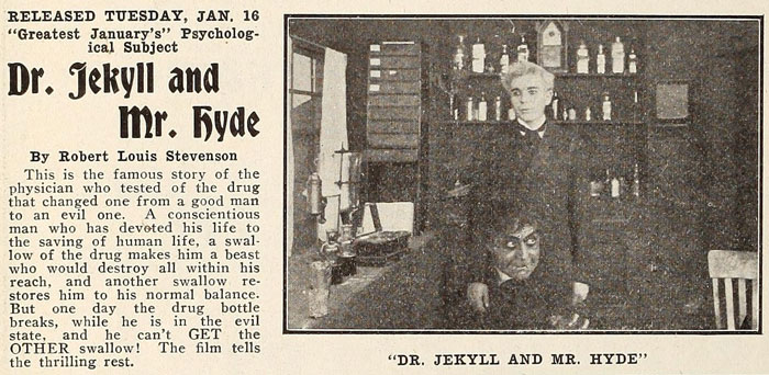 I should also mention that there is some question as to whether or not Cruze played Hyde in all scenes. Harry Benham, who also worked for Thanhouser at the time and resembled Cruze, claimed that he played Hyde in some scenes. This would have been a logical way of expediting the production as the crew would not have been obliged to wait for Cruze to apply his Hyde makeup and change costumes before resuming work.