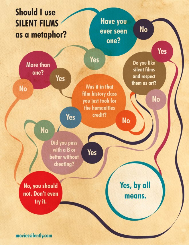 I’m the first one to admit that silent movies are not the most popular subject for metaphorical speech but I do sometimes run across them being (mis)used in that context. And so, since I had a bout of insomnia, here is a handy chart that will tell you whether or not you should use silent movies in your next metaphor.