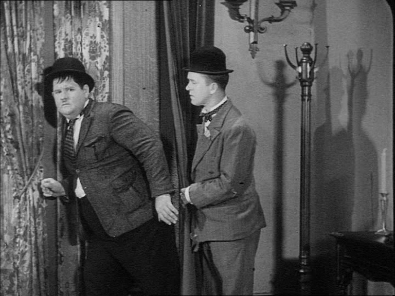 The Home from the Honeymoon mischief-makers have evolved from thieves to sticky-fingered vagrants to a pair of homeless chums plagued by Murphy’s law. After Stan refers to a beat cop as “ma’am” the pair have to skedaddle and take refuge in a basement. Finding themselves locked in, the duo make their way upstairs and, in a snowballing bit of comedy, are forced to commit themselves deeper and deeper into their impersonations. They don’t want to steal anything, they just want to get out of the mansion without getting caught by a vindictive cop.