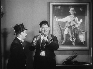 On the other hand, Stan and Ollie in Duck Soup are vagrants pretending to be princes. Ollie sports a monocle and a cigar case full of stubs. He slides into the role of Colonel Buckshot readily and seems to thoroughly enjoy himself. After all, he is living his own fantasy.
