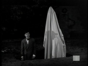As it turns out, Ledoux (Charley Rogers), Padilla’s butler, is actually an undercover cop assigned to keep an eye on the old loon. As corpse-snatching is a definite no-no, the professor is taken away and Ledoux sets out to stop the grave robbery already in progress. To that end, he dresses himself in a white sheet and sneaks into the cemetery ahead of the boys.
