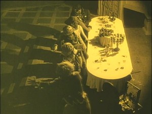 Briefly, it turns out that everything was a hallucination induced by the puppeteer. During this hallucination, Man forces his trio of friends to stab Woman as she is tied to the dining room table. Her lover tries to stop them with all his might… well, some of his might… well, he just kind of gives up and weeps, truth be told. Anyway, she dies, the lover stabs the husband and then—Ding!—everyone wakes up from the dream induced by the shadow puppeteer. (For real this time. We… think.) The guests are contemptuously dismissed by the chastened wife and the puppeteer is well-paid for his troubles. The end.