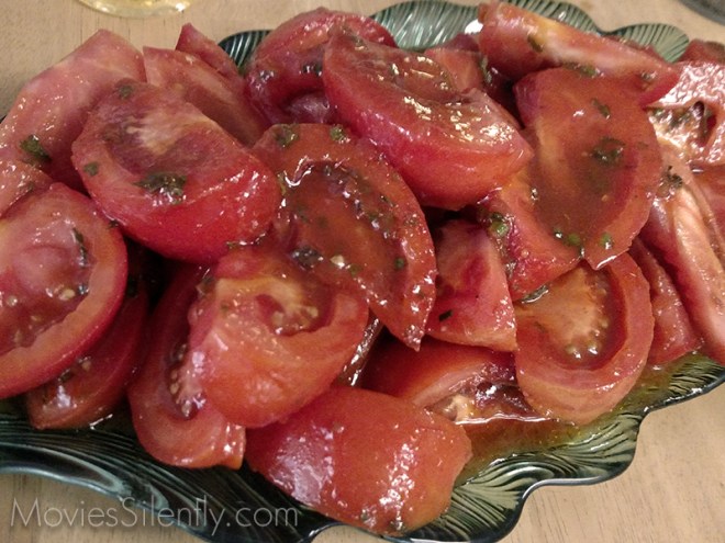 The recipe wasn’t totally clear as to whether the tomatoes are supposed to marinate in the dressing or be dressed with it before serving. I split the difference and poured it over the tomatoes 45 minutes before serving.