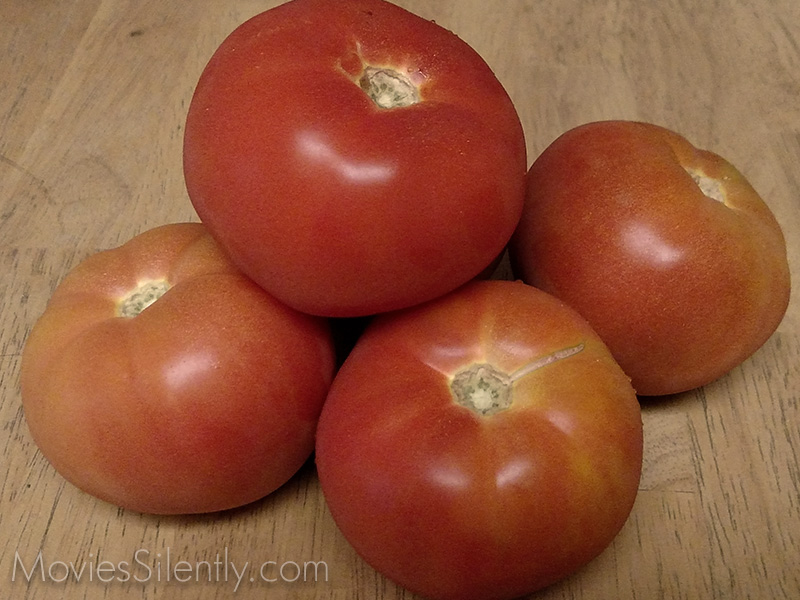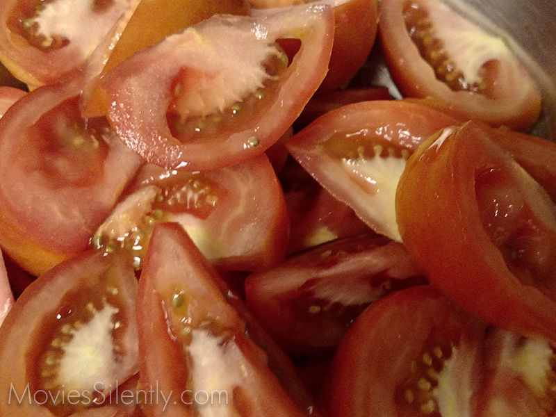 For tomatoes, the weirdly long winter put me in a bind. My garden fresh tomatoes were planted late and so would ripen late, so I decided to see if the recipe would work with grocery store hot house tomatoes. I sliced them into eighths.