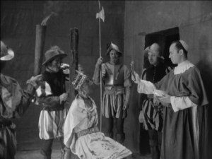 Meanwhile, everything Arawicu has spoken of is coming to pass. The Spaniards arrive and capture Atahualpa. Although a ransom of a roomful of gold is delivered, the conquistadors strangle him anyway. Calicuma, enraged by the murder, gathers his army to fight the invaders but falls in battle. Wara Wara’s mother is killed when the Spaniards invade the palace and she flees with the priest Huillac Huma (Arturo Borda).