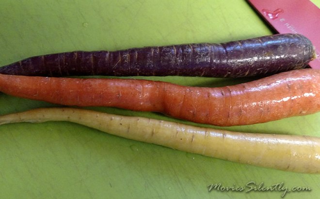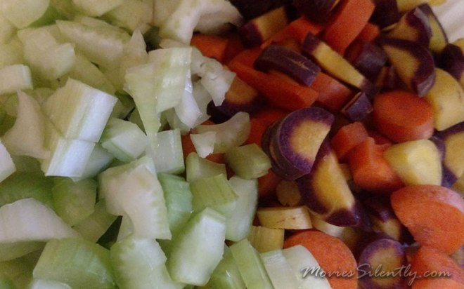 I just used a supermarket chuck roast. I didn’t have enough people to consume five pounds of meat, so I bought a 1.5 lb. roast and adjusted the recipe accordingly. The celery and onions were your standard supermarket models (yellow for the onion) but I got zany with the carrots. The multicolors don’t survive cooking but they’re fun to use.