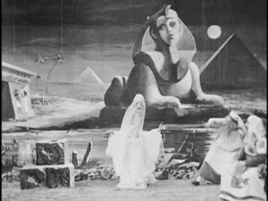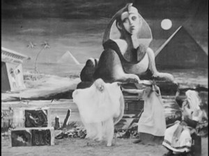 The term Book of the Dead was coined by Karl Richard Lepsius, a Prussian Egyptologist who published a translation of a book of sacred burial rites and religious beliefs in 1842. Méliès would have likely had at least a passing familiarity with the famous text, though of course The Monster does not aim to replicate Egyptian rites so much as set a general mood of exoticism.