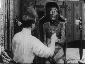 This was not the only or last mummy-themed comedy. Vitagraph returned to the well the following year with The Dust of Egypt, in which Antonio Moreno plays a young man whose life turns inside out when a mummy in his care (Edith Storey, Moreno’s usual partner) comes to life and grapples with telephones and matches. 1915 also saw the release of When the Mummy Cried for Help, an Al Christie-directed comedy with Lee Moran and Eddie Lyons. The infamous Ebony Film Corporation also got in on the act in 1918 with Mercy, the Mummy Mumbled.