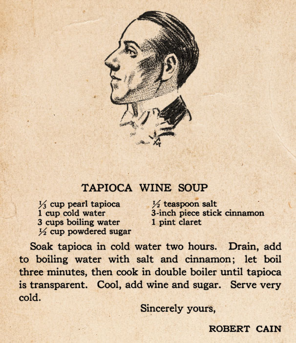 Like most good things, this story starts with a bag of tapioca pearls. I had just completed Francis X. Bushman’s mushroom soup (don’t ask) and was left with most of a bag of organic tapioca. I wanted to use it up so I skimmed through my collection of vintage celebrity cookbooks, as one does, and came across this recipe from a 1916 publication: