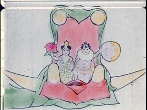 I have seen it mentioned that McCay hand-colored all 4,000 Little Nemo drawings himself but this shows a lack of understanding of how movie color worked in 1911. Color film did exist at the time but the process did not capture the full color spectrum and there were problems with syncing up the colors on the screen, resulting in blue-green or red fringing if anything went wrong. Using color motion picture film would have resulted in FEWER colors showing up on the screen.