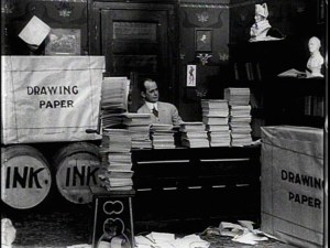 Giant boxes of paper and barrels of ink are delivered to McCay’s workroom as his collection of drawings grows. A goofy messenger boy manages to knock over and mix up the stacks of paper but, proving that this is a reenactment, McCay does not murder him. In fact, he still manages to deliver his “drawings that move” to his delighted friends. And hand-colored, yet!