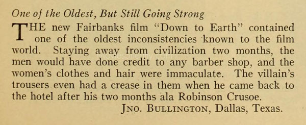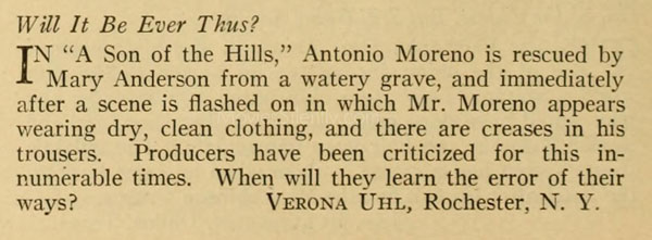 Photoplay had a feature called Why-Do-They-Do-It that invited readers to point out errors in then-current releases. Let’s enjoy a few complaints from the good old days and appreciate that the world has changed a lot but moviegoers are still moviegoers. It’s a good thing these folks didn’t have Twitter!