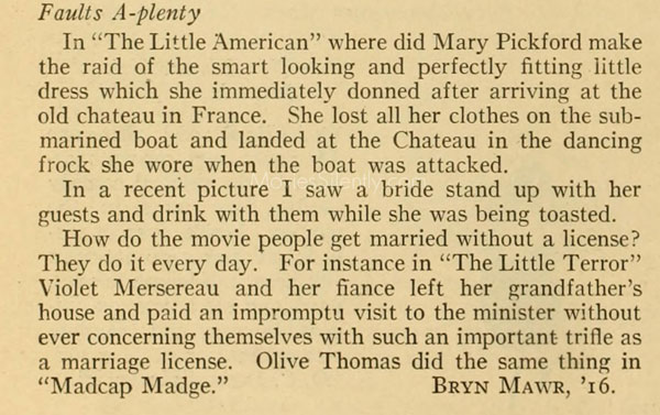 The reader signed as Bryn Mawr ’16 makes some good points, Mary Pickford did indeed find a smart frock rather quickly considering there was a war on.