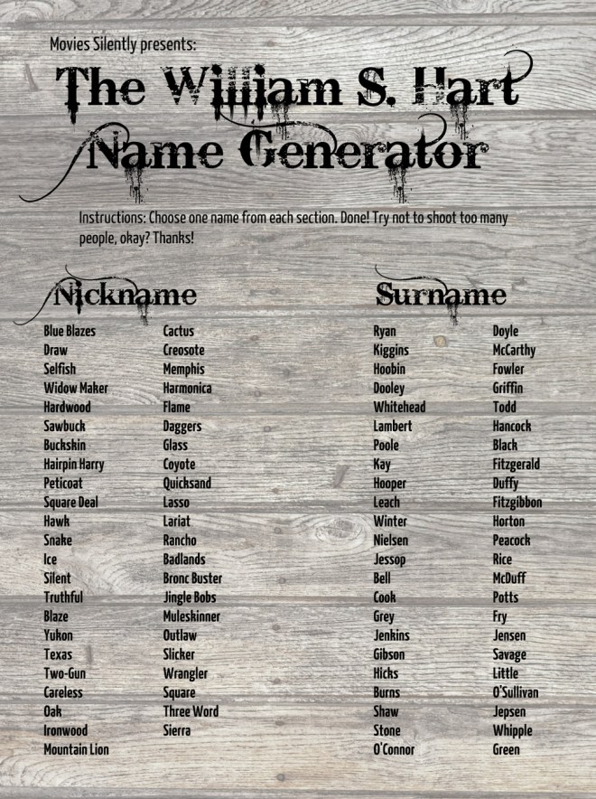 I recently watched a William S. Hart movie in which his character is named Robert Evans, which is a huge departure from his usual movie monikers. He’s usually called Wolf or Blue Blazes or Buckskin or something. In light of that, I thought I would dust off the William S. Hart name generator.