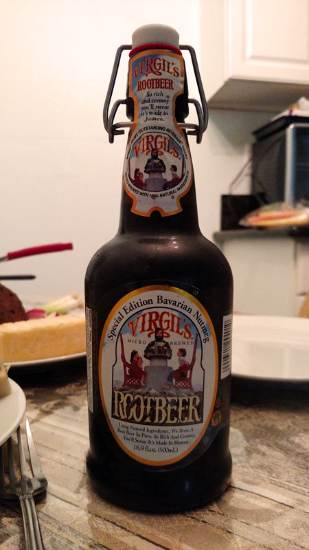 Finally, the recipe was published during Prohibition and so it calls for near beer. In modern American terms, this means a beer with no more than 0.05% alcohol. (Most real beers have been 4% and 14% alcohol, though some are stronger or weaker.) I am not a huge beer drinker, especially not with the modern hops-mad microbrewing trend, so I decided that my “near beer” would be Virgil’s Root Beer. Completely legal in any era and darn tasty.