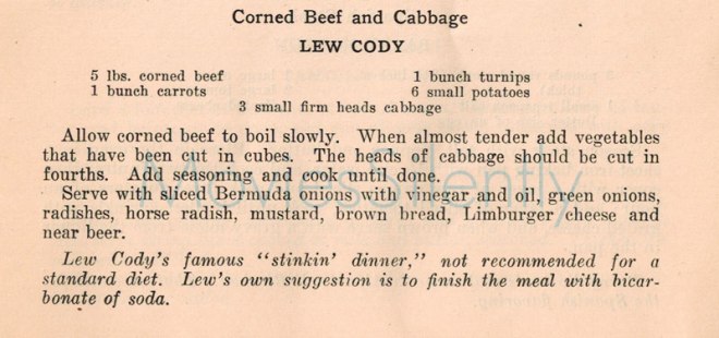 Lew’s dinner looks delicious! I did make some corned beef and colcannon this past weekend for St. Pat’s Day. Is cooking cabbage supposed to be the smelliest thing ever? I boiled plenty for the colcannon on Saturday- no lingering aroma even that evening. I’ve never found cooked cabbage to be particularly smelly (how could it ever beat out liver and onions for staying power in that dept?).