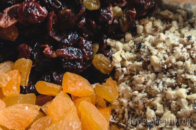 Currants are not easy to come by in my neck of the woods so I decided to substitute dried apricots, one of my favorite dried fruits. I also used a golden raisin/dried cranberry/dried sour cherry blend instead of just plain raisins. Walnuts were my nut meats of choice but pecans would also be delicious, I think.