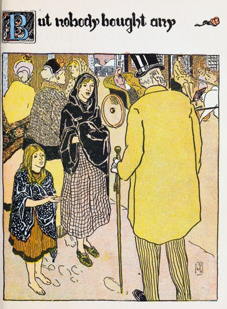 Hans Christian Andersen’s 1845 story The Little Match Girl (Den Lille Pige med Svovlstikkerne) should be pretty familiar. A small child tries to sell her wares on the freezing street. Nobody buys them and she doesn’t dare return home without a single sale. As she slowly dies, she ignites the matches and is delighted by the visions of warmth, food and family that she sees. The next day, her frozen body is discovered by people who cannot know what she saw before her death. Curtain.