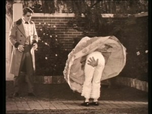 However, this film is an overall delight. It is smoother and better written than Mickey and the glimpse backstage is particularly enjoyable. Normand shows once again why she is a star with an engaging and engagingly goofy performance. While the lion sequence is justly praised (Normand attempts to beat him back with a feather duster) I also enjoyed the screen test for its simple-but-hilarious concept. Sue accidentally sits on a workman’s glove, which leaves a distinct print on her white pantaloons. Normand makes the most of her costume, flipping her hoop skirt and adding just enough exaggeration to her flouncing.
