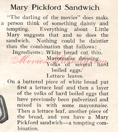 Welcome back! I am cooking my way through the 1929 Photoplay Cookbook but sometimes I take detours. Today, I am preparing the last sandwich from a collection published back in 1916. The idea was to capture a popular female star’s personality in sandwich form. Today’s star is one of the biggest of all time.