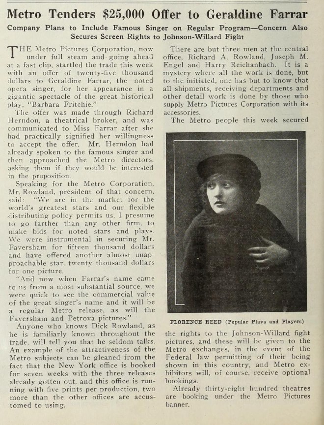 I mentioned Geraldine Farrar earlier. I wonder if this film was in part inspired by her upcoming motion picture debut (due officially to the need to rest her voice). I mean, besides the obvious Gerald/Geraldine thing, the dates line up. The earliest reference I can find is a $25,000 offer from Metro in April of 1915. The Stolen Voice was released in August of that year, so plenty of time between the announcement and production. Farrar would sign on with Lasky, be teamed with DeMille and the rest is history.