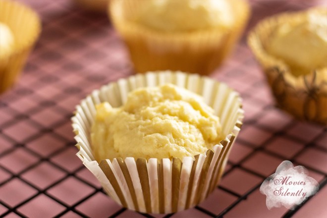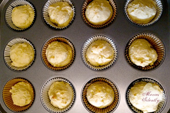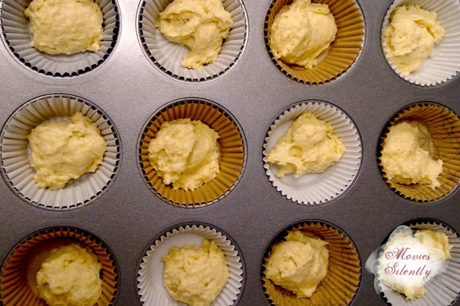 The batter is really more the consistency of drop biscuit dough: wet but definitely too thick to pour. I was concerned about density and the middles not getting done so I opted for small muffins. I put about two teaspoons into each muffin liner and ended up with a dozen. (I used Wilton Elegance Cupcake Liners. Aren’t they cute?)