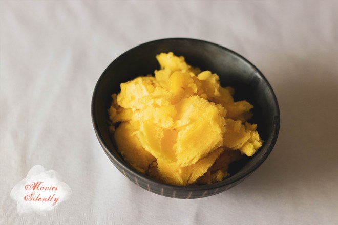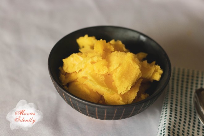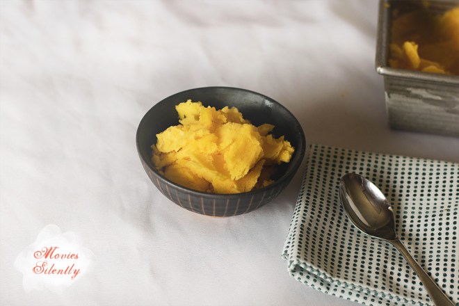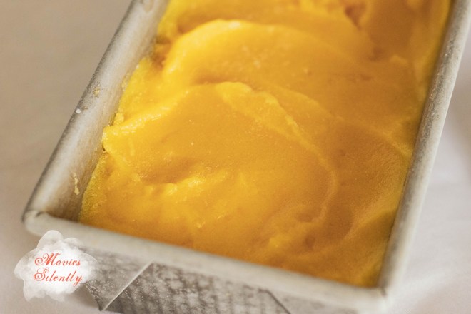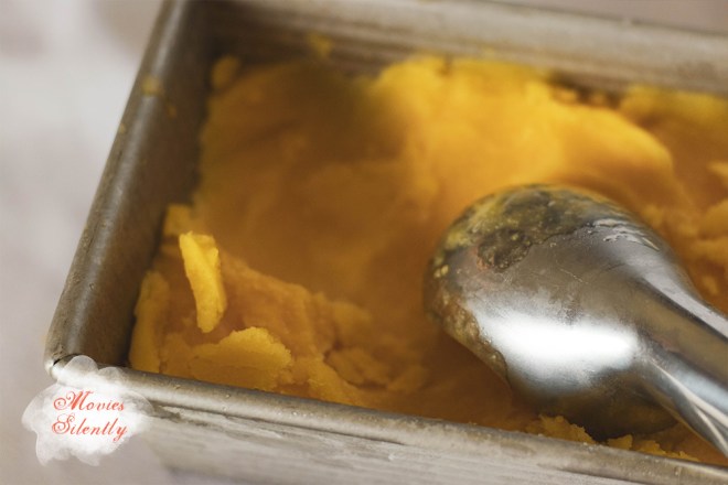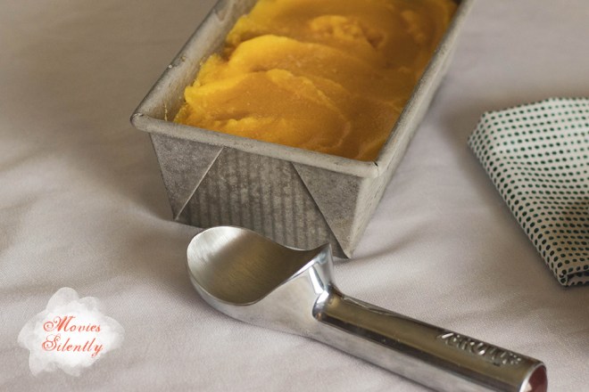 The texture was more like an ice, very hard and dense, but as I stated above, I think that’s probably my fault for not using the heavy syrup. If you don’t have an ice cream maker, you can just pour the puree into a pan and stir it every twenty minutes. Or you can use a fork and once it starts to freeze, scrape it to make a crystalish granita.