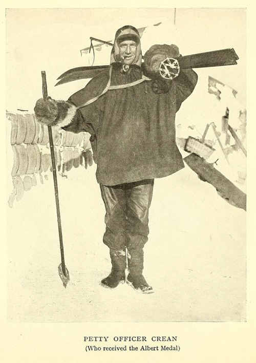 Lt. Evans grew weaker and weaker during the return journey but he was fortunate in his companions. Lashly and Crean were heroic, no two ways about it. (Wilson and Atkinson had both voted for Lashly to be in the polar party and Atkinson had also advocated for Crean. Scott had chosen P.O. Evans over their objections but Lt. Evans benefitted.) They helped their commanding officer along and dragged him on their sled when his strength gave out. He ordered them to leave him behind but they disobeyed and heaved him along all the same. Unfortunately, Lashly’s foot became frostbitten and it was clear that the team would not make it if they continued as they were. They made the fateful decision to send Tom Crean to walk for eighteen hours in terrible weather to get help. He had no tent, no survival equipment, just some biscuits and chocolate to eat and he made it. Crean met Atkinson, Girev and a dog team, who were able to whisk Lt. Evans and Lashly away for medical attention but this played havoc with Scott’s already messy scheduling.