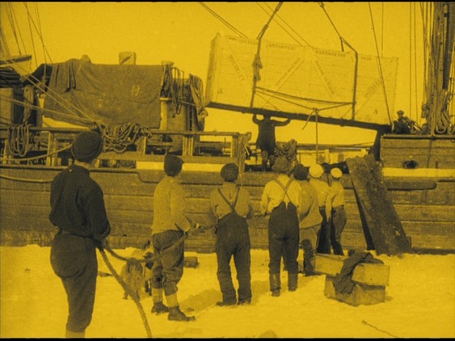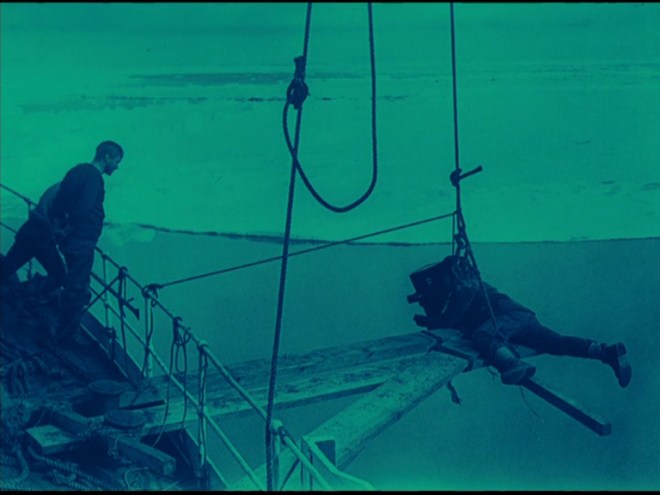 This is ironic given the extreme cold that he faced in order to capture his images. As the footage demonstrates, the thick fur mittens that would have protected his hands from frostbite could not be worn while operating the hand-cranked camera. Other issues included the need to leave the camera outside so that condensation would not form and the glass plates for still photos had to be slowly brought up to temperature lest they crack. Fortunately, Ponting was a professional’s professional and took all challenged in stride, delivering the promised photos and footage and later presenting them with a showman’s flair.