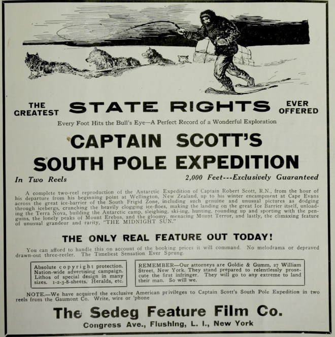 Whatever your opinion of Scott, there is one fact that is beyond dispute: the man knew his audience. Before departing for the Antarctic in 1910, he secured the services of Herbert Ponting, an experienced photographer who had traveled extensively, particularly throughout East Asia. Ponting was to take still photographs and motion picture footage that Scott would then incorporate into his lectures. (Scott already had a lecture tour booked for his anticipated return to England in 1912.) Such multimedia presentations were wildly popular and a combination of motion pictures and painted slides was seen as particularly fine. (For example, L. Frank Baum toured with a multimedia presentation entitled The Fairylogue and Radio-Plays.) Further, footage was sold in standalone packages for worldwide distribution.