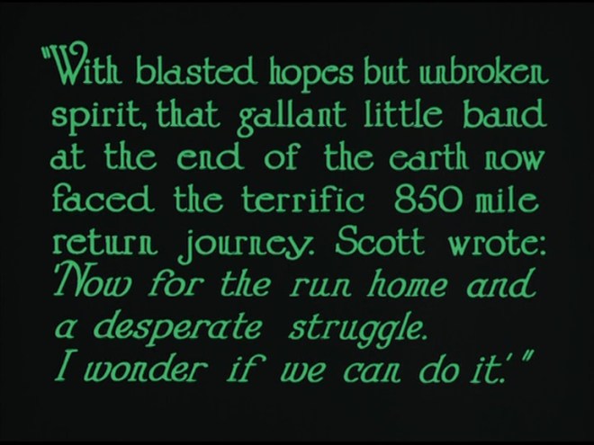 Using genuine footage of Antarctica, studio sets and location filming in Scandinavia, the cinematography makes liberal use of the work of Herbert Ponting in creating the icy landscape. (The film includes a nod to Ponting, showing him grinding away on his camera as the polar team departs.) It’s an absolute stunner and worth seeing for the cinematography and production design alone.