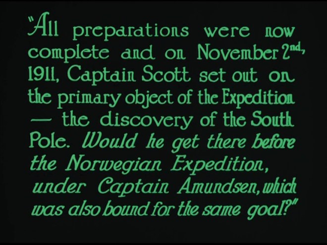 One of the most significant edits can be found in Scott’s account of reaching the Pole. In his original notes, Scott writes about discovering that Amundsen’s team has beaten him and “Now the run for home and a desperate struggle to get the news through first. I wonder if we can do it.” The published version omits a significant line and reads as “Now the run for home and a desperate struggle. I wonder if we can do it.” Of course, this changes Scott’s meaning and homecoming goal entirely and makes his situation sound much graver, a true victim of Norwegian cunning. In fact, Scott hoped to salvage the situation somewhat by scooping Amundsen and expressed no doubts as to his team’s chance of survival at this point in his journey. Both The Great White Silence and the 1948 biopic Scott of the Antarctic use this second version, their makers likely believing this was what Scott really wrote.