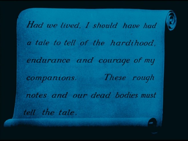 Members of Scott’s team set out on a recovery mission, discovered the tent, the bodies and Scott’s diary, along with letters to family. The film concludes with excerpts from Scott’s Message to the Public: “Had we lived, I should have had a tale to tell of the hardihood, endurance, and courage of my companions which would have stirred the heart of every Englishman. These rough notes and our dead bodies must tell the tale.”