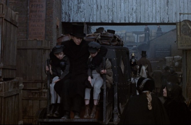 Further, Kate’s embarrassment at the vulgar jesting of Mulberry Hawk seems out of place because up until that point, we have seen the PDAs of the Squeers and Nicholas prancing around sans shirt. A Hollywood-friendly atmosphere of mild sleaze and beefcake, in other words. The problem is that the film then switches gears and goes full Victorian when we simply have not spent enough time with “normal” characters to establish the social mores. This can be blamed on reducing Kate’s screentime, we see so little of her that there is no chance to establish her respectability in the context of the period.