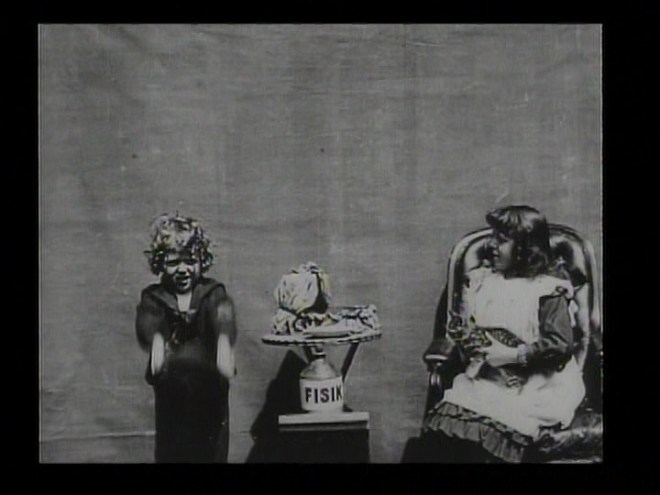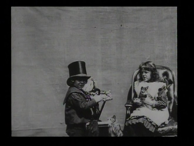 The whole thing is very sweet and runs less than a minute (or slightly over a minute if you want to start debating projection speeds but I certainly don’t want to touch that particular argument with a plastic fishing rod). I mean, we have kids, a kitten and dress-up, you’d have to be an ogre to find fault with this particular combination. Also, the kitten is at ease and clearly knows the children, so there is none of the discomfort one sometimes experiences when watching animal performers. (Early British films were often charming family affairs. For example, Rescued by Rover co-starred filmmaker Cecil Hepworth’s own dog and baby.)