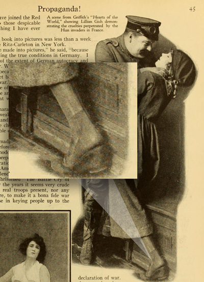 I realize, of course, that France manufactures some of the finest silk stockings, and that possibly they are cheaper there than here ( I paid two and a half for the last pair I bought) but still do you really think Marie (Lillian Gish) in “Hearts of the World” would be quite likely to insist on silk hosiery to wear while going through the perils of life in a town in the hands of the enemy? I wonder!