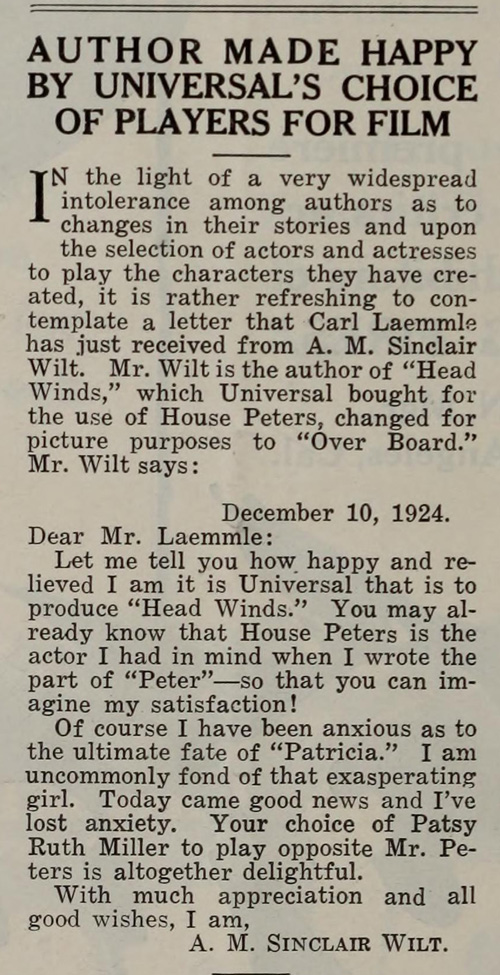 Interestingly enough, the author of that novel wrote in to Laemmle’s office to let him know that she approved of the casting of House Peters, who was actually the performer she had in mind when writing the part. So one person was happy at least.