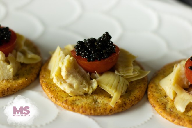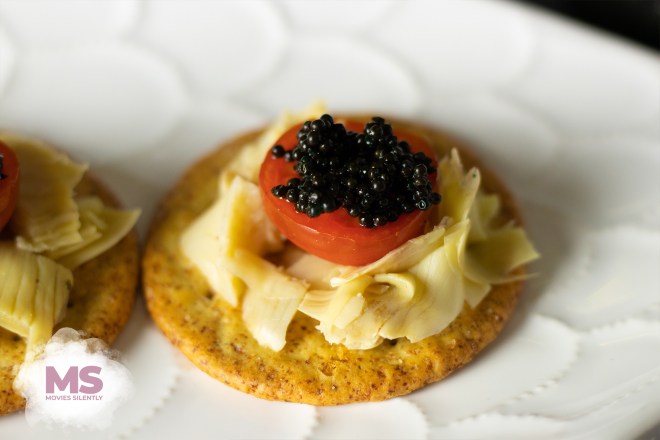 The instructions call for you to make sort of a little tomato doughnut and rest the caviar in the center but I found that everything stayed together beautifully by simply stacking the halved tomato on a bed of artichoke with a dollop of caviar on top. You’ll want to be sparing because caviar does have a strong flavor. A little dab will do ya. I used maybe 1/4 or 1/3 teaspoon per cracker.