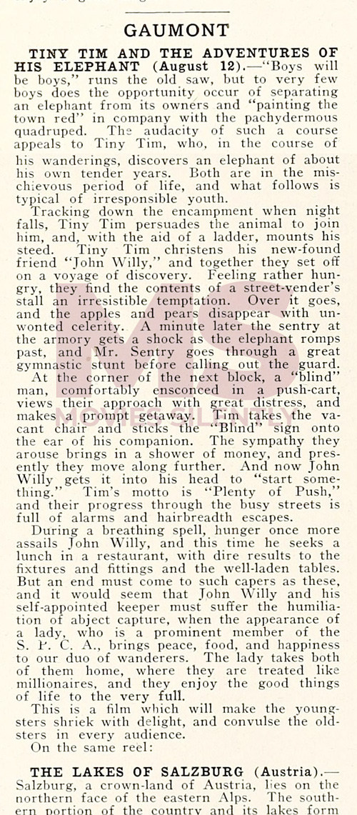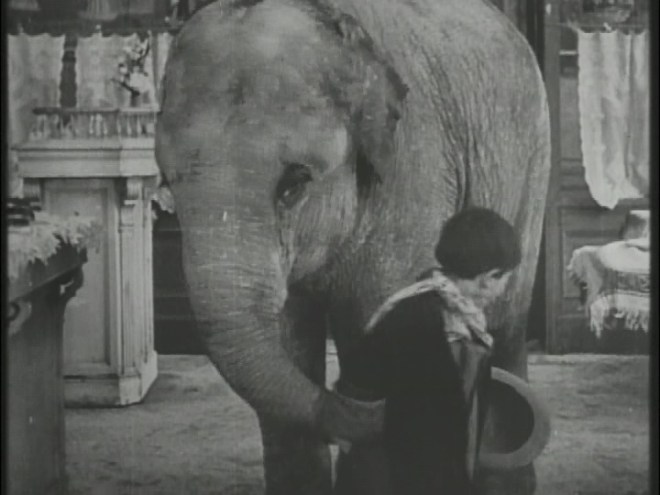 In a contemporary review, we are told that the elephant is named “John Willy” and that he was stolen in the night, which would indicate blue tinting for the day-for-night shots. Whether or not this was employed in the French release, I cannot say but it does show that the scenes were likely blue in the American edition. There are also several phrases in quotations in the review, though whether they are quotes of the American title cards or simply a way of indicating slang usage (which was common at the time) cannot be confirmed.