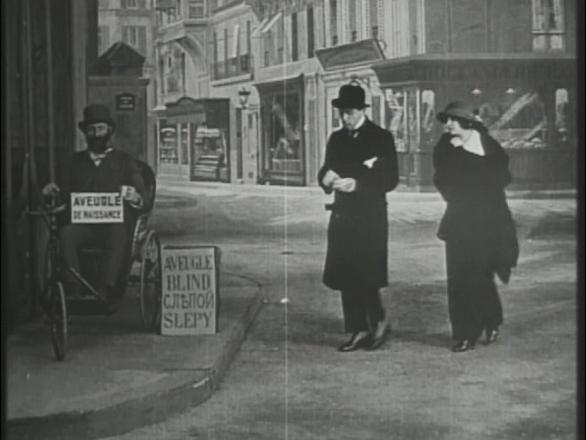 At one point in the film, Bout de Zan and his elephant startle a “blind” beggar and reveal that he can actually see. The exposing of a fake blind man was a reasonably common joke that crossed international borders. It was the main plot point of the 1913 Edison Kinetophone short The Deaf Mute and it was a throwaway gag in the Russian comedy Chess Fever.