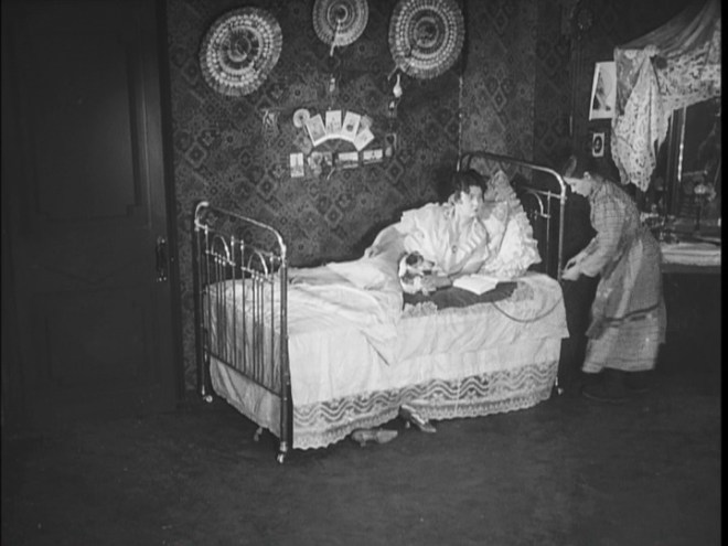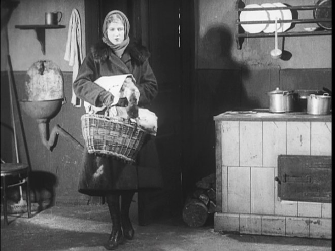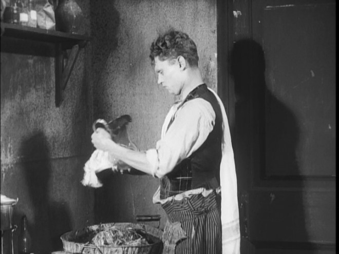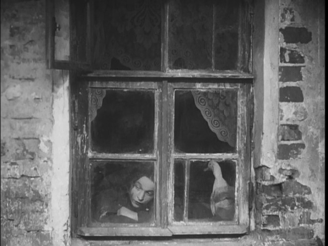 I don’t want to say that clever visual flourishes are gone entirely from cinema but they were employed so beautifully in the silent era. For example, when Semyon discovers Paranya on the streetcar tracks, he bundles her into his car and takes her back to his apartment. Jealous Marisha, carrying a dead duck that she likely intended for an evening meal with Semyon, watches them drive away and then when she returns to Trubnaya, she sees Paranya’s duck happily quacking away in the window of Semyon’s apartment. She returns to her own rooms and tosses down her dead duck.