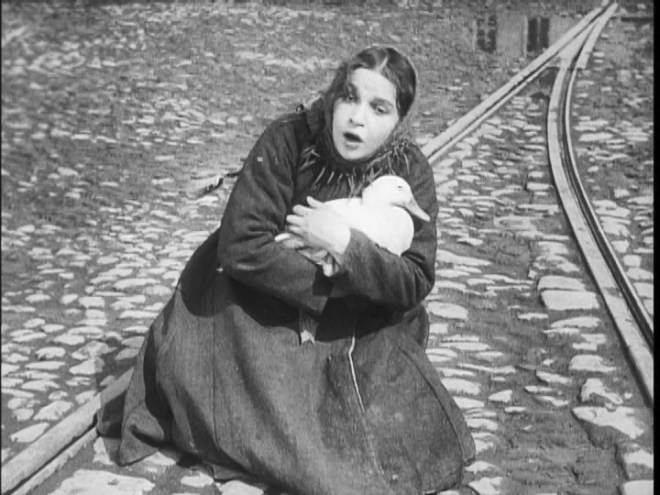 Earlier in the film, Paranya’s aunt sends her off to Moscow to find her uncle but just as the girl departs, the uncle disembarks from another train—he has come home. The aunt very nearly gets herself run over trying to stop Paranya from leaving. This proves to be a genetic trait as Paranya’s duck escapes and she tries to chase it down, nearly getting herself run over in the process.