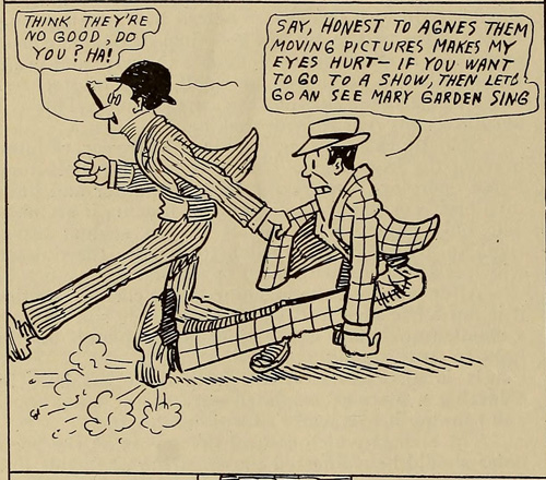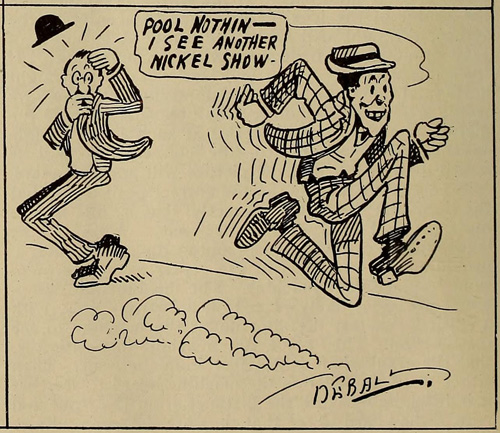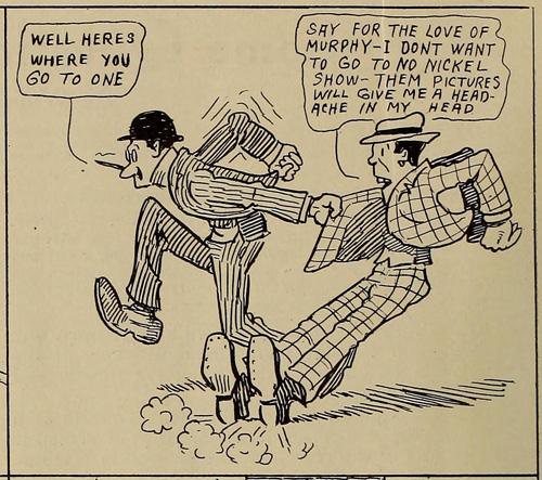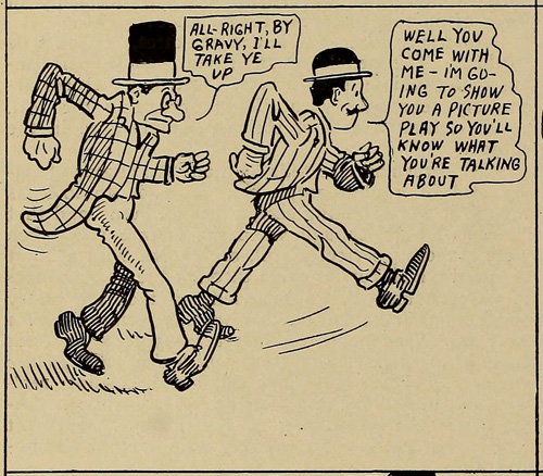I stumbled on some comics in a 1911 issue of Nickelodeon magazine that address the issue of movies being dismissed sight unseen and I thought they would be amusing to share. They are credited to “DEBALL” and I am not sure if it’s “De Ball” or “D.E. Ball” or simply “Deball” so let me know if you have any further info on this artist.