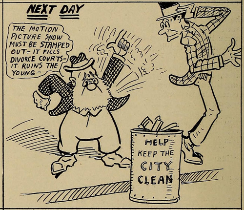 So, we can see that the “don’t knock ’em ’til you try ’em” message of these cartoons addressed a very serious problem. Snobbish uplifters did not like the movies and were determined to stomp them out or at least regulate them out of business.