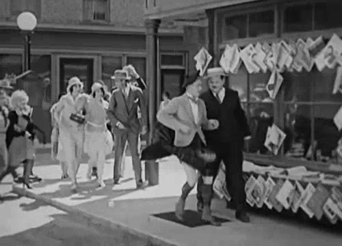 Spoilers, I guess: Throughout the film, Philip has been chasing a fashionable young lady (Dorothy Coburn), who is none too pleased at the attentions of this strange fellow. That’s a pretty typical comedy setup used by everyone from the Marx Brothers to the Muppets. I have to say, though, I rather liked the payoff of the gag. Mumblethunder decides to show off his status by introducing Philip to the woman of his dreams but Dorothy makes a face and walks on. Philip decides to chivalry where pursuit failed and puts his kilt over a mud puddle. Dorothy hops over it, looks back and mimics Philip’s distinct leap before disappearing. It’s not this huge punchline or anything, I just rather enjoyed seeing the pursued woman get a bit of her own back.