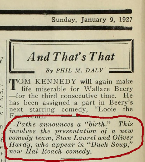 Putting Pants on Philip is sometimes cited as the first “real” Laurel and Hardy picture, though I have to disagree. Duck Soup ticks almost all of the boxes and was advertised as their debut as a duo. It was thought lost for years and due to a lack of information, historians assumed that Hardy played a minor role but the recovered picture shows that he was an equal star onscreen. Yes, they are not quite Laurel & Hardy™ yet in that picture but they’re not all the way there in Putting Pants on Philip either.